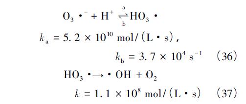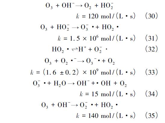 因此,臭氧直接氧化机理可分为亲电反应、亲核反应以及加成反应。O3直接氧化存在选择性,面对饱和脂肪族等有机物,O3难以直接将其氧化; 并且O3性质不稳定,会自行分解并释放出热量,如式( 29) 所示: