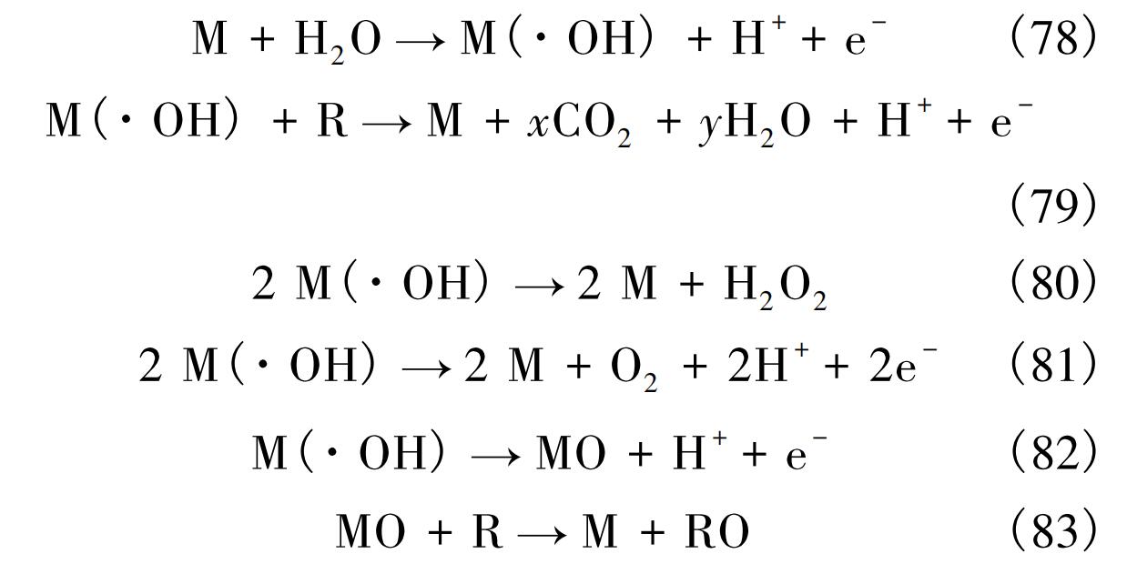 随着 AOPs 的兴起,出现了利用电化学方法处理废水的技术。目前,该类技术发展了许多稳定高效的电极材料,DSA 电极( dimension stable anodes) 、BDD电极( boron - doped diamond anodes) 、Ebonex 电 极、 NTA 电极( nanotube arrays) 等。电化学氧化是指利用电场直接氧化或间接产生·OH、O-2·等自由基降解污染物。其机制主要分为阳极直接氧化和间接自由基氧化。前者是指吸附在阳极的有机分子因失去电子而被氧化,但降解能力有限;后者是指通过电极反应产生·OH、O-2·等自由基或O3、H2O2 等氧化剂氧化有机分子。在水相中,H2O 在阳极表面被氧化成吸附态的·OH,也可能分解产生O2、H2O2 等。此外,还可能使阳极材料进一步转化为更高价的氧化态 MO,如式( 78) —( 83) 所示: