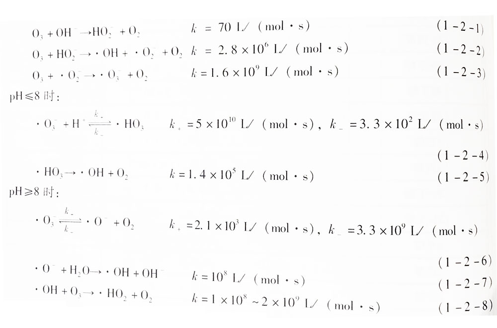 除了OH¯,溶液中还有其他物质可以生成HO?¯、?O?¯,也可引发臭氧链式分解反应,如H?O?、腐殖质、无机金属离子(Fe²+、Co²+、Mn²+)等。相关反应式如下: