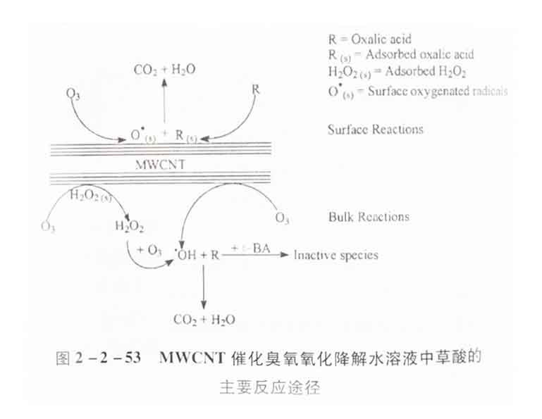 从另一个角度看,t-BA在MWCNT上的吸附量很少,绝大部分t-BA都在液相中存在,因此可以完全抑制液相反应中产生的·OH氧化草酸。然而,图2-2-52显示在t-BA的存在下,草酸依然存在一定的去除率。如果反应发生在MWCNT表面,t-BA几乎不会影响草酸被·OH氧化。因此,草酸臭氧氧化的自由基机制涉及在MWCNT上的表面反应和溶液本体中的反应。