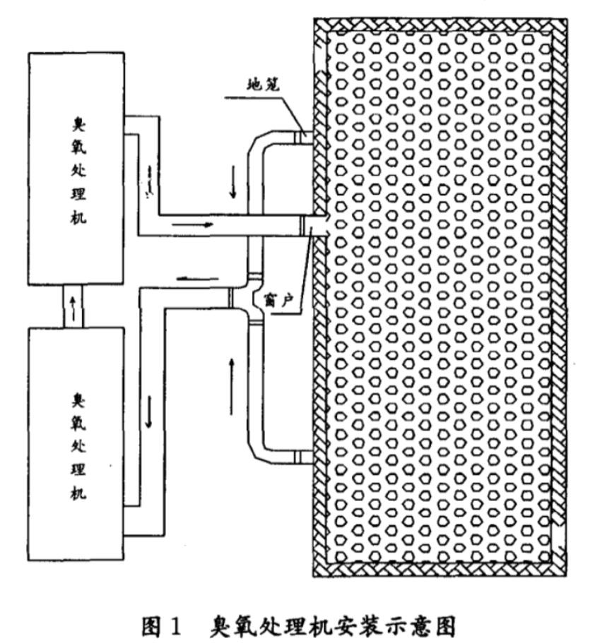2台臭氧处理机同时使用,采用串联方式以增加臭氧发生量,臭氧的很终出口加软管引出与两通风口连接。然后将臭氧处理机的进风口和仓房的一个窗户连接,其余门窗关闭,形成一个封闭的回路。试验时为保证安全性,我们进一步完善设备的密封性,尽量减小臭氧外泄,具体安装如图1所示。