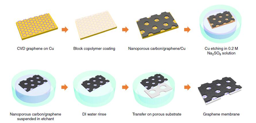 原子厚的石墨烯薄膜是很薄的分子屏障,因此结合了分子大小的孔,它可以被视为很终的膜。几个分子模拟表明,石墨烯中的二维纳米孔可以产生高气体渗透性,比传统膜可达到的高几个数量级2、3、4、5、6、7、8、9、10、11。这种高通量膜可以显着减少分离一定体积的分子混合物所需的膜面积,解决了无机膜长期存在的放大问题。石墨烯晶格的热稳定性和化学稳定性以及高机械强度,即使孔隙率高达 5%12,13,也使其对气体分离极具吸引力。很近,已经开发了几种在石墨烯晶格中加入亚纳米孔的蚀刻方法,从而为液体和溶解的离子带来了有希望的筛分性能14,15,16,17。然而,从单层石墨烯膜中分离气体混合物的演示仍然是一项具有挑战性的任务18,19。通过测量双层石墨烯微球的放气率证明了概念验证,其中孔隙通过多次紫外线处理20。一般来说,通过单层石墨烯的分子传输研究主要是在微米级的域上进行的,这归因于微机械剥离的可扩展性差,以及化学气相沉积 (CVD) 衍生石墨烯的转移具有挑战性。 Celebi 等人。报道了一种 2500 μmμm2 尺寸的双层石墨烯膜,通过另一种石墨烯膜掩盖石墨烯膜中的裂缝21。使用聚焦离子束,纳米孔阵列(直径> 7.6 nm)被结合,导致渗出的气体传输。很近,报道了一种承载分子大小孔的厘米级单层石墨烯膜,然而,在转移过程中产生的裂缝限制了分离选择性接近 Knudsen 扩散的预期(H2/CH4 和 He/SF6 选择性为 3.2和 8.0,分别报道)18。总体而言,从足够规模的单层石墨烯膜中分离气体混合物的演示仍然难以捉摸。为了开发石墨烯膜,需要 (a) 将大面积石墨烯转移到多孔载体上而不产生裂缝和撕裂,以及 (b) 产生具有窄孔径分布 (PSD) 的分子大小的孔。这种方法的开发还将允许人们研究气体传输机制(活化与表面与 Knudsen 传输),以及通过石墨烯纳米孔的竞争吸附的影响。