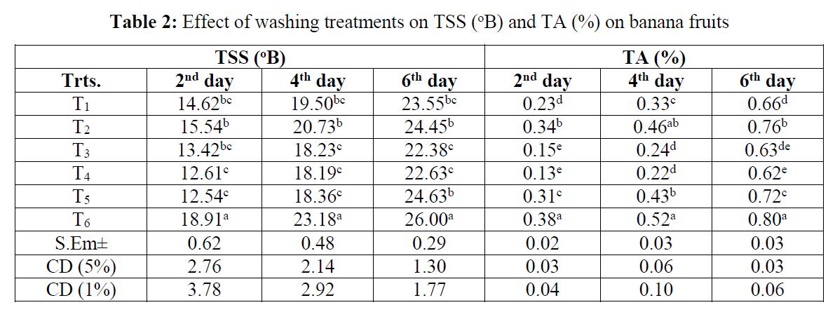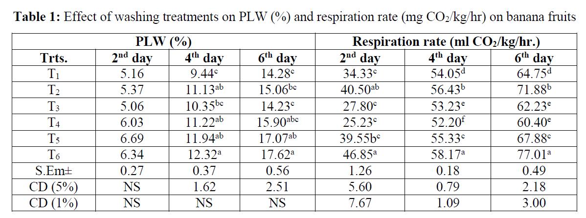 表面清洗处理对常温贮藏香蕉新鲜果实的品质有显著影响。在生理体重减轻方面,各处理间有显著差异。未处理果实的生理重量损失很大,而臭氧处理和次氯酸钠处理果实的生理重量损失很小(表1)。未经处理的水果中很高,次氯酸钠和次氯酸钙处理的水果中很低(表1)。未经处理的水果中较高的生理体重损失和呼吸速率可能是由于正常加速的水果代谢活动。水果的体重下降可能与呼吸过程中储备碳水化合物的分解、水分的流失以及内外因素的变化有关。果实失重减少的原因可能是臭氧的作用,臭氧对蒸腾作用起到了保持水分的作用。也可能减缓了呼吸速率从而减少了定量恶化。