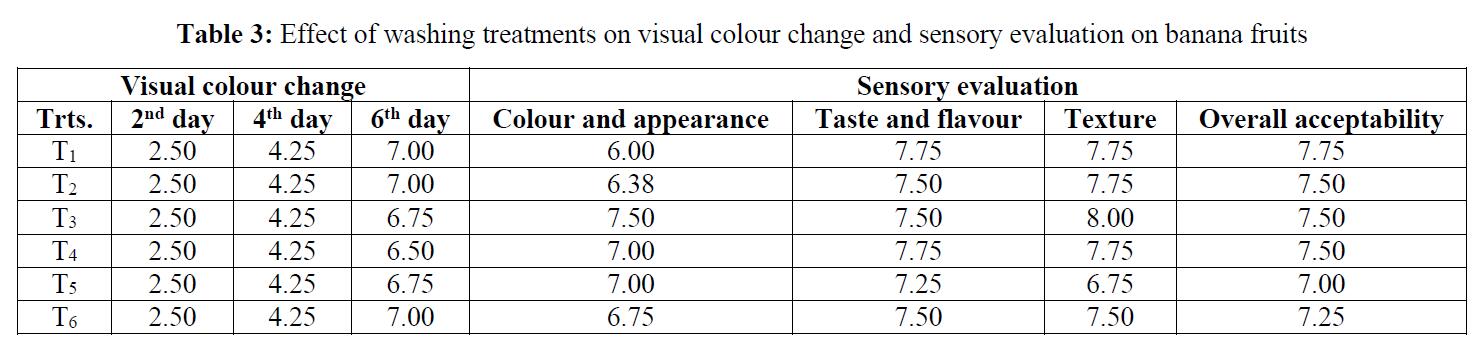 从本研究可以看出,经过洗涤处理的果实品质保持良好,外观美观。有关视觉色彩变化的数据见表3。水果的颜色变化在未处理的水果中是很先出现的,然后在处理的水果中出现,但在贮藏末期,处理的水果和未处理的水果之间没有显著差异。在包括未经处理的水果在内的所有处理中,颜色的发展与更年期高峰密切相关(Tapas等人,2016)[2]。在更年期开始前开始的颜色发育在更年期高峰时完成(Leoseck, 1950)[12]。第6天末对果实进行感官评价。两种处理之间没有显著差异。然而,经臭氧处理的果实在所有参数上得分很高。