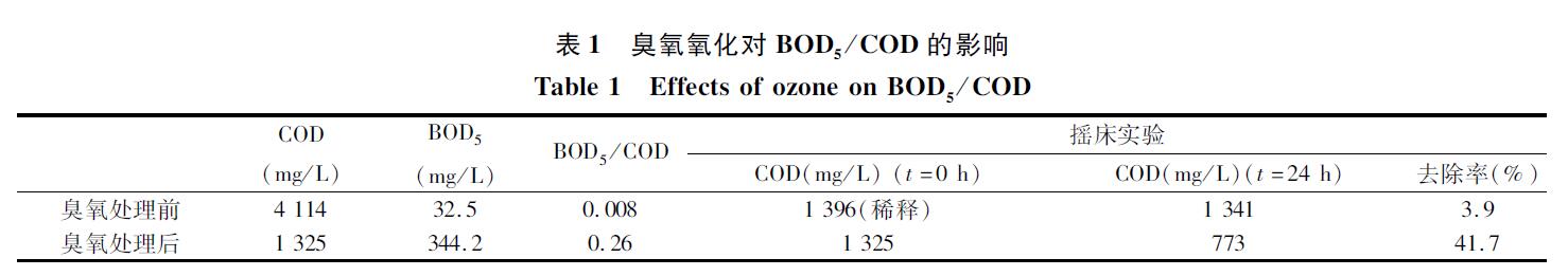 采用臭氧处理浓缩液,产生的羟氧自由基能破坏浓缩液中难生物降解的大分子有机物及腐殖酸类物质,生成易于生物降解的小分子有机物或使其彻底矿化为CO2和水。如表1所示,浓缩液经臭氧氧化处理90min后,可生化性能有明显提升,BOD3/COD由原来的0.008提升到0.26。浓缩液经臭氧处理后,再进行摇床实验,COD去处率较浓缩液原液的去除率也有明显提升,由原液的3.9%的去除率提升到41.7%。所以可以得出结论,浓缩液经过臭氧处理后其生化性能有明显提升。