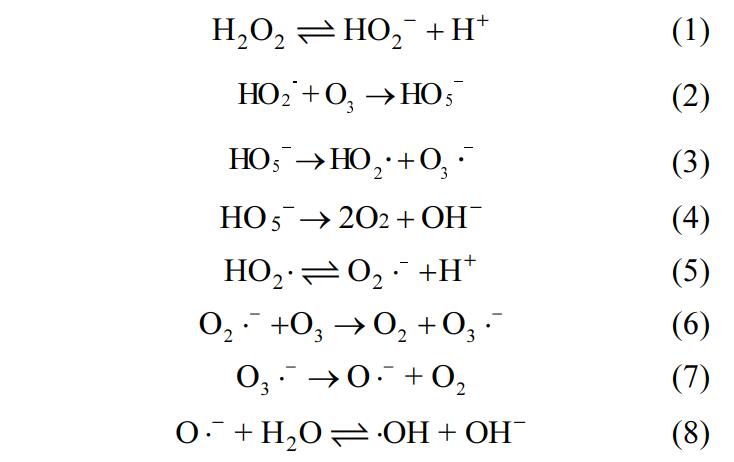 水 本文研究了在恒定臭氧浓度(84mg/L)下,不同H2O2投加量(以 30%浓度的 H2O2溶液计)对焦化废水 COD 去除效果的影响.投加 H2O2 显著地促进了O3/TiO2-NF对 COD 的去除(图 2a),当 H2O2投加量为5g/L 时,O3/TiO2-NF/H2O2 工艺(60min)的 COD 去除率 63.6%,是 O3/TiO2-NF 工艺(25.8%)的 2.5 倍.此外,图 2b 还显示 H2O2 投加量从 0.1g/L 增加到5g/L,COD 去除动力学常数从 6.55×10-3min-1 增加到 2.21×10-2min-1,提高了约 3.4 倍.这是因为投加H2O2 促进了 O3 均相转化为羟基自由基.由于 HO2-与 H2O2 解离平衡(式(1),pKa=11.8)[19], H2O2 通过解离产生 HO2-,其会与 O3 分子发生快速链式反应(式(2),二级反应动力学常数 - HO ,O2 3k = × 9.6 6 10 mol/(L s) ⋅ ,产 生 HO2•和 O3•,在进一步生成强氧化剂·OH[20],如式(3~8)所示.