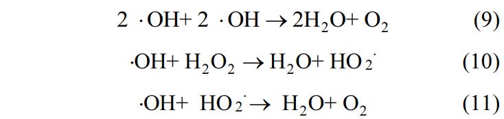 然而,过量地增加 H2O2 并不会进一步提升COD 去除率,反而会抑制 COD 去除率和速率.如图 3 所示,当 H2O2 投加量增加到 10g/L 时,COD去除率和反应动力学常数分别降低到 56.2%和k10g/L =1.49×10-2min-1,相比 5g H2O2/L,降幅分别为 11.6%和 32.4%.这主要原因是溶液中存在大量 H2O2 时会与·OH 发生淬灭反应[21],如式(9~11)所示.