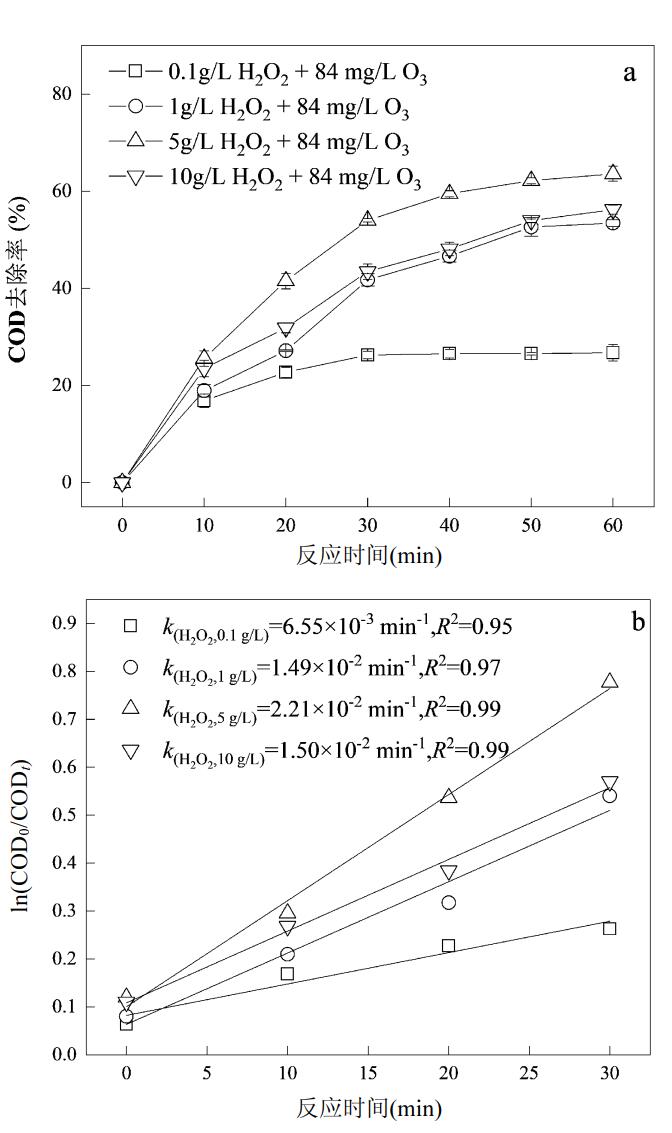 图 2 不同 H2O2投加量下,O3/TiO2-NF/H2O2工艺对焦化废水COD的去除率(a)和COD去除动力学(b)