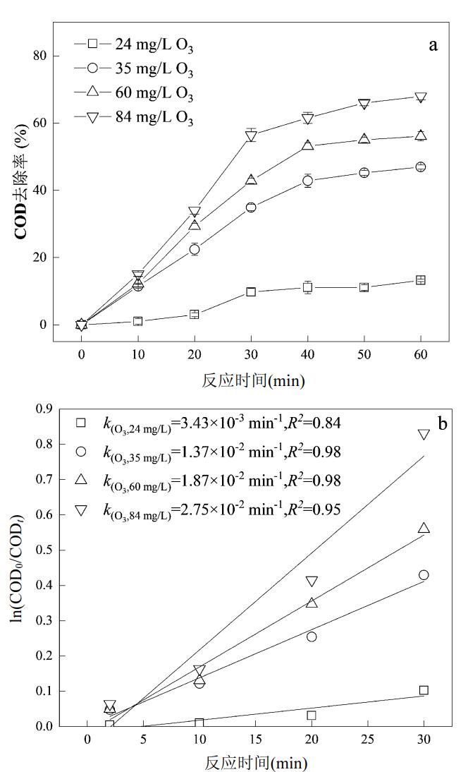 本文研究了电-多相臭氧催化工艺对焦化废水COD 的去除,考察了 O3浓度对 COD 的去除的影响.结果表明,增加臭氧浓度会显著提高 COD 的去除效率和速率.如图 3a 所示,O3浓度为 84mg/L 时, COD去除率(67.9%, 60min),是 O3 浓度 24mg/L 时的 5.1倍,COD 去除常数 k84mg/L (2.74×10-2min-1)约为 k24mg/L (3.43×10-3min-1)的 8 倍.