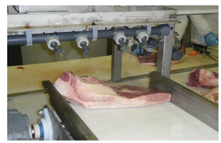 输送机上的牛腩喷洒臭氧水溶液