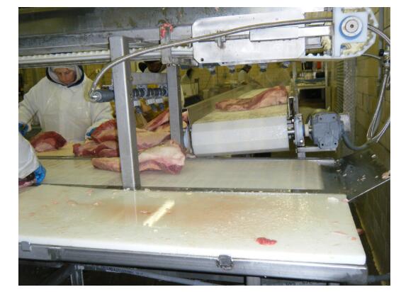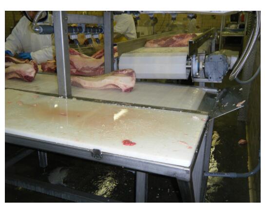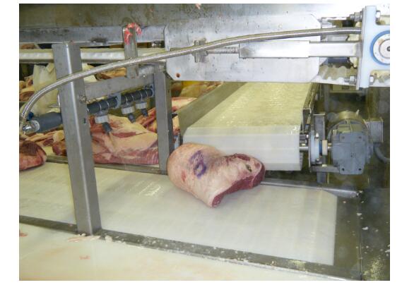 当牛腩从一个输送机过渡到下一个输送机时,由于设计原因,它会翻转侧面