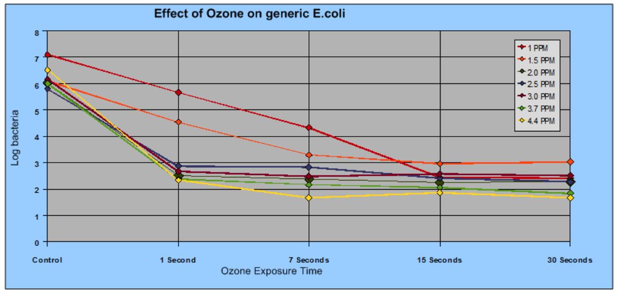 我们所做的工作表明,低于2.0 ppm的臭氧水平可以有效地消除细菌,但需要更长的接触时间。而臭氧浓度高于2ppm对效果微乎其微。有关这项工作的更多细节,请参阅下面的图表和此处的论文参考。