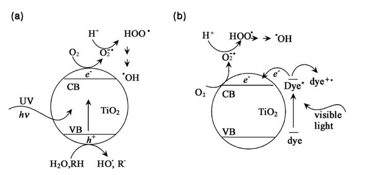 ?图1所示。紫外(a)和可见光(b)下TiO2光催化氧化反应机理图[47]。