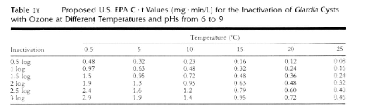 在瓶装水生产的装瓶步骤之前,水消毒过程应应用于所有水处理和水源水调理的下游。消毒过程仅限于较小的微生物,如细菌和病毒。FDA没有要求对较大的寄生虫进行消毒,比如隐孢子虫,因为75%的瓶装水使用地下水作为水源,预计不会含有隐孢子虫,另外25%的瓶装水使用已经处理过的公共供水。瓶装水的臭氧消毒预计将处理溶解臭氧浓度在0.1 - 0.4毫克/升范围内的较小微生物。六种微生物所需的Ct值见表IV和表v。在估计20分钟的总接触时间内,溶解臭氧浓度为0.1 mg/l和0.4 mg/l将提供2.0和8.0的Ct值。