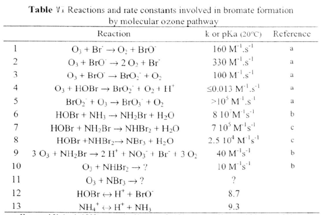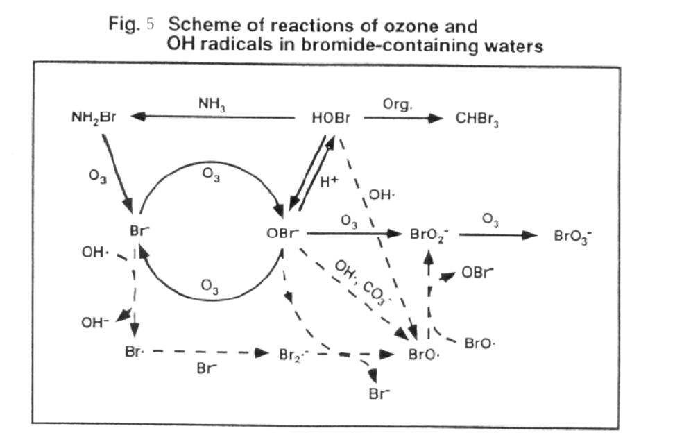 溴酸盐的形成由一系列复杂的多重反应组成。对此已经进行了非常详细的研究(7),总结如下图5和表6所示。如图5所示,溴化物首先被臭氧氧化为氢溴酸。氢溴酸解离成氢溴酸离子的程度取决于水的pH值。然后水溴酸盐可以被臭氧或羟基自由基进一步氧化。氧化产物是溴酸盐。个别反应及其速率见表六。
