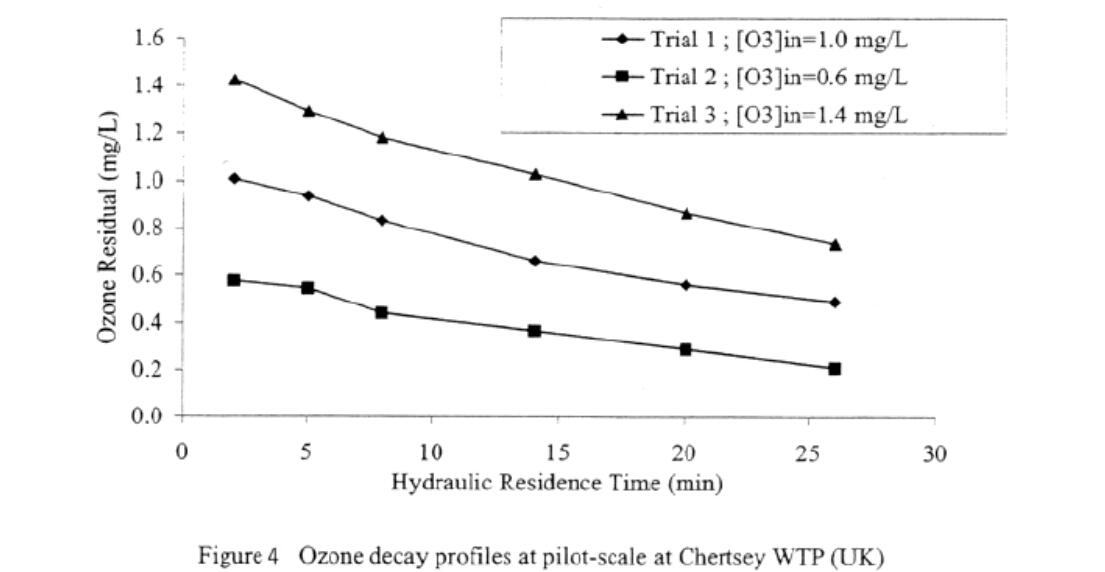 3. 分解:臭氧在室温和近室温条件下是一种不稳定的化合物,迅速分解为氧气。臭氧的分解速率主要受水温和pH值的影响。在20℃和pH值7.0时,臭氧在饮用水中的半衰期通常为24分钟。参见图4。