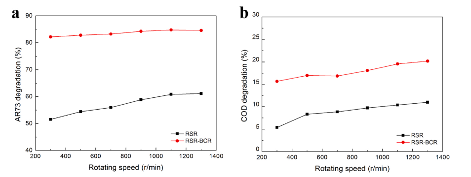 图2所示。转速对a) AR73降解效率的影响;b) COD降解效率。