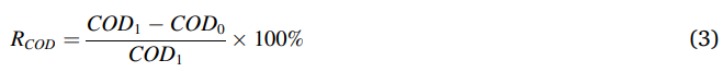 式中,RCOD为COD降解效率,COD1、COD0分别为降解前后水样的COD, mg⋅L−1。