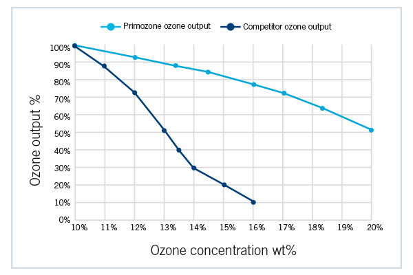 Primozone 技术在臭氧浓度较高时的生产能力是竞争技术的 7 倍以上。提供高臭氧浓度和高臭氧容量/输出。