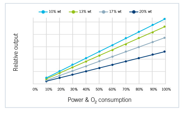 独立于臭氧输出保证高臭氧浓度。从 100% 输出的峰值需求到 10% 的很低需求,能量和氧气消耗将相应地下降到 10%?;痪浠八?,臭氧浓度是恒定的。