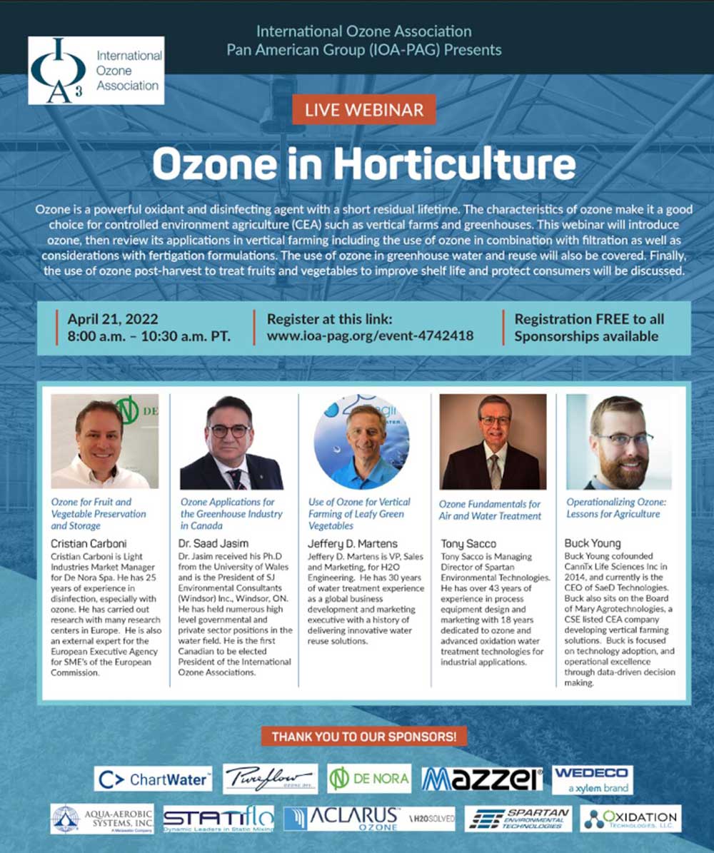 国际臭氧协会将于 4 月 21 日举办一场关于在园艺中使用臭氧的网络研讨会。该网络研讨会将涵盖臭氧为园艺行业带来的好处以及如何很好地使用臭氧的重要技术提示。单击下面的图片可定向到 IOA 网站,以了解有关此网络研讨会的更多信息并进行注册。