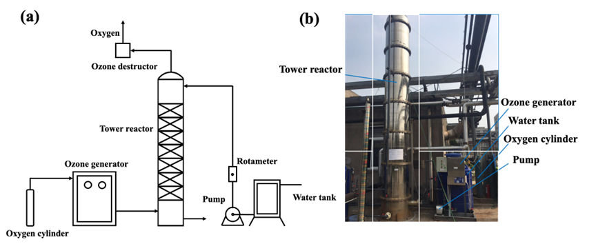 Fig. 3. (a) Schematic and (b) photo of the tower reactor experimental setup. Copyright 2023, Elsevier Inc.