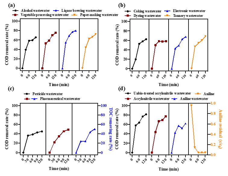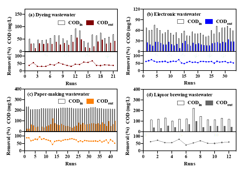 Fig. 6. Removal characteristics of organic pollutants in different industries wastewater by continuous flow testing in tower reactor(O3/ΔCOD of dyeing, electronic, paper-making and liquor brewing wastewater were 0.8-2.4, 0.3-3.5, 0.9-4.0 and 1.0-4.0, respectively). Copyright 2023, Elsevier Inc.